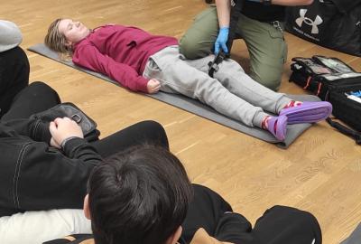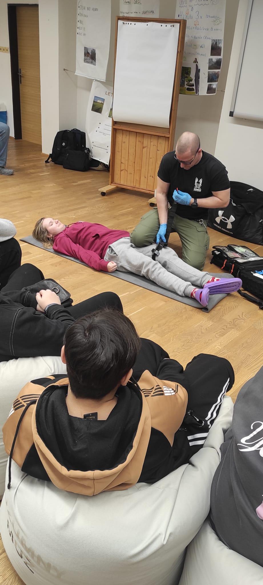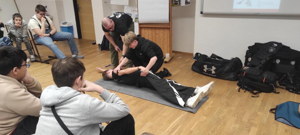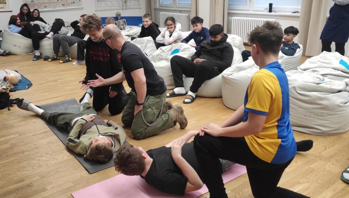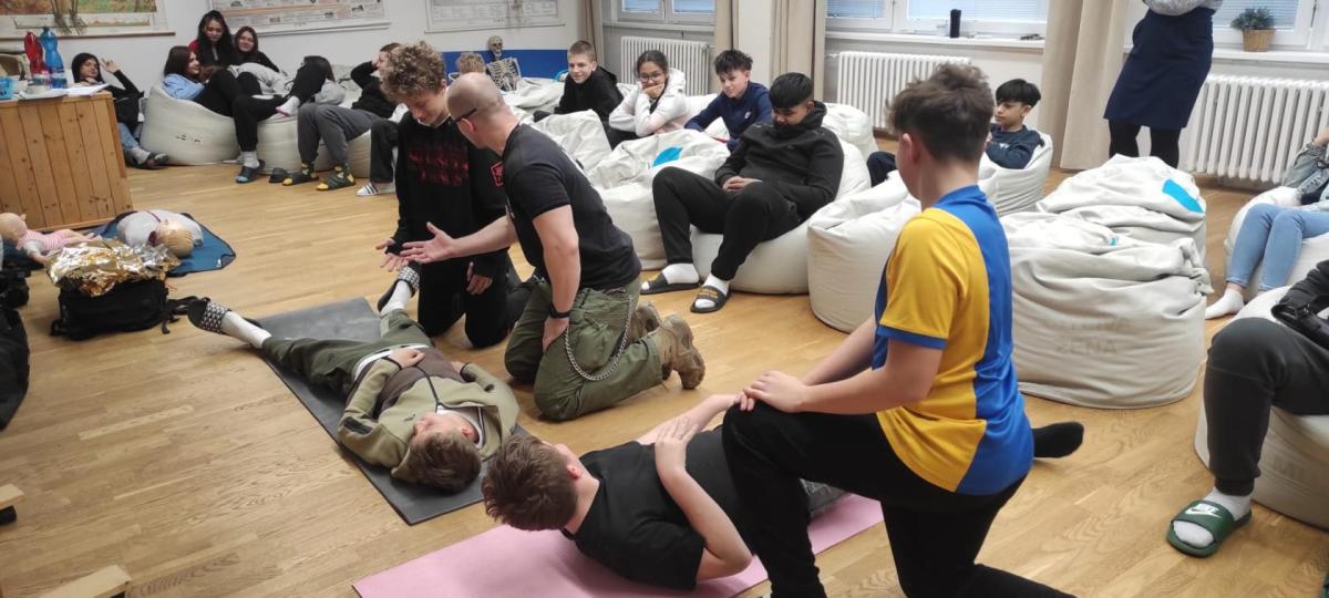 Součástí akce byly praktické ukázky, při nichž si žáci mohli první pomoc sami vyzkoušet a aktivně se zapojit.