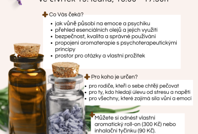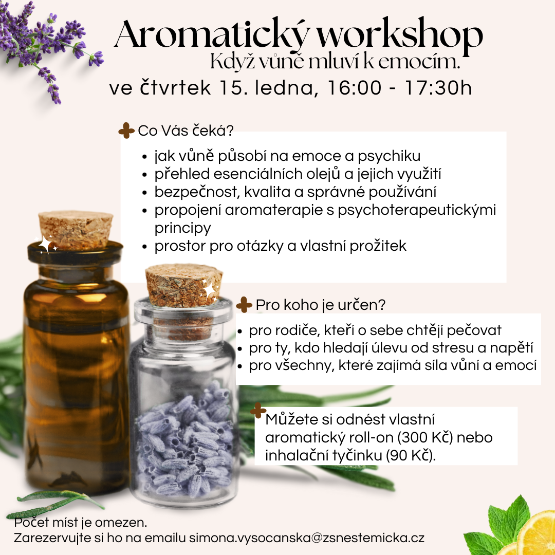 Zveme rodiče žáků ZŠ na interaktivní aromaterapeutický workshop nazvaný "Večer s vůní", který propojuje svět vůní, emocí a psychoterapeutických přístupů. Setkání se uskuteční ve čtvrtek 15. ledna od 16:00 do 17:30 a nabídne prostor zpomalit, dopřát si chvíli pro sebe a objevit, jak mohou esenciální oleje jemně, ale účinně podpořit zklidnění, emoční rovnováhu i celkovou pohodu. Během workshopu se s vůněmi nejen seznámíte po teoretické stránce, ale především je budete moci vědomě prožít a objevit jejich vliv na vlastní emoce a vnitřní rovnováhu.